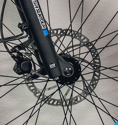 Die Suntour MOBIE A-32 Federgabel erhöht den Fahrkomfort deutlich und gleicht Unebenheiten zuverlässig aus. Dies zeigt seine Vorteile sowohl auf städtischen Kopfsteinpflasterstrecken als auch auf unbefestigten Wegen. Ergänzt wird der Komfort durch die TEKTRO hydraulischen Scheibenbremsen, die in allen Wetterlagen für präzise und sichere Verzögerung sorgen. Die Bremsleistung vermittelt Sicherheit und Kontrolle, was insbesondere in unvorhersehbaren Verkehrssituationen von hoher Bedeutung ist.