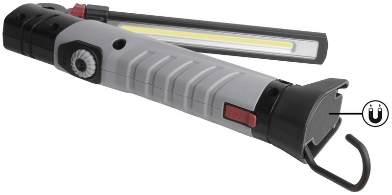 Diese leistungsstarke und dimmbare Handlampe mit 700 Lumen bietet durch die flexible um 180° faltbare und 180° schwenkbare Lichtrichtung für jede Situation die richtige Beleuchtung. Mit einem starkem Magnet und einem klappbarem Haken lässt sich der Anwendungsbereich individuell anpassen.