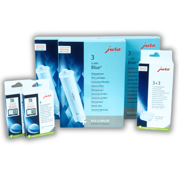 Rundum gepflegter Kaffeegenuss – Jura Dreierpack Claris Blue+ inkl. Pflegeset Midi (9 Filter + 12 Reinigungstabletten + 6 Entkalkungstabletten)
