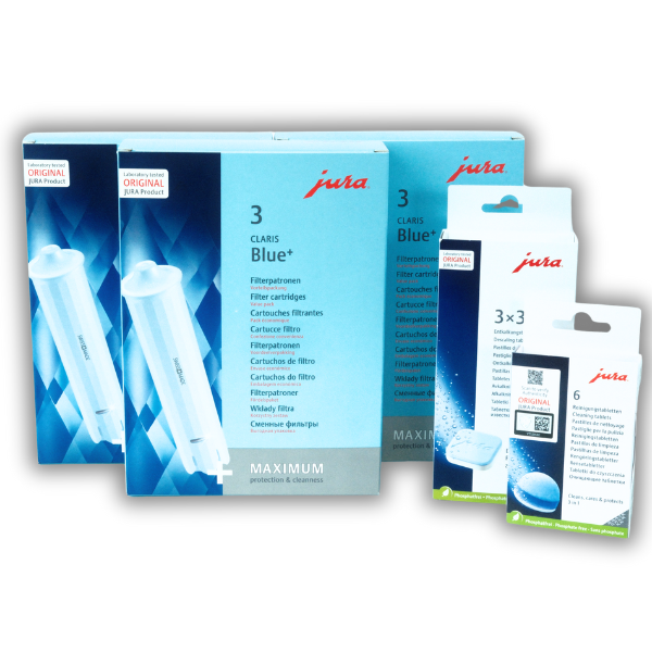 Reines Wasser und sorgsame Pflege – Jura Dreierpack Claris Blue+ inkl. Pflegeset Mini (9 Filter + 6 Reinigungstabletten + 6 Entkalkungstabletten)