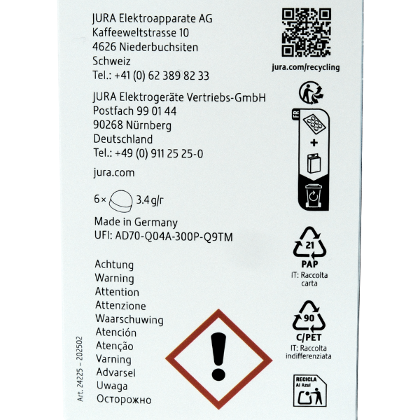 Das Pflegeset Mini ergänzt die Pflege ideal: Reinigungstabletten entfernen Kaffeefette und Rückstände zuverlässig, während Entkalkungstabletten die Maschine wirksam vor Ablagerungen schützen. So bleibt der Vollautomat hygienisch sauber, langlebig und voll funktionsfähig.