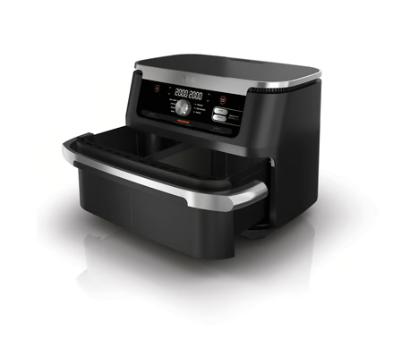 Mit einem riesigen Fassungsvermögen von 10,4 Litern bietet die FlexDrawer Platz für Mahlzeiten für bis zu acht Personen. Die innovative Doppelkorb-Bauart ermöglicht es, zwei verschiedene Gerichte gleichzeitig zuzubereiten – unabhängig voneinander, mit unterschiedlichen Temperaturen und Garzeiten. Ob knusprige Pommes und saftige Hähnchenschenkel oder Gemüse und Fisch – alles gelingt perfekt abgestimmt.
