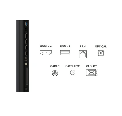 Das Design ist schlank und zeitgemäss gehalten. Der schmale Rahmen lenkt den Fokus vollständig auf den Bildinhalt und sorgt dafür, dass sich der Fernseher harmonisch in unterschiedliche Wohnumgebungen einfügt. Die hochwertige Verarbeitung unterstreicht den technischen Anspruch des Modells. Umfangreiche Anschlussmöglichkeiten erlauben die einfache Verbindung mit Zuspielgeräten wie Konsolen, Receivern, Streaming-Boxen oder Soundsystemen.