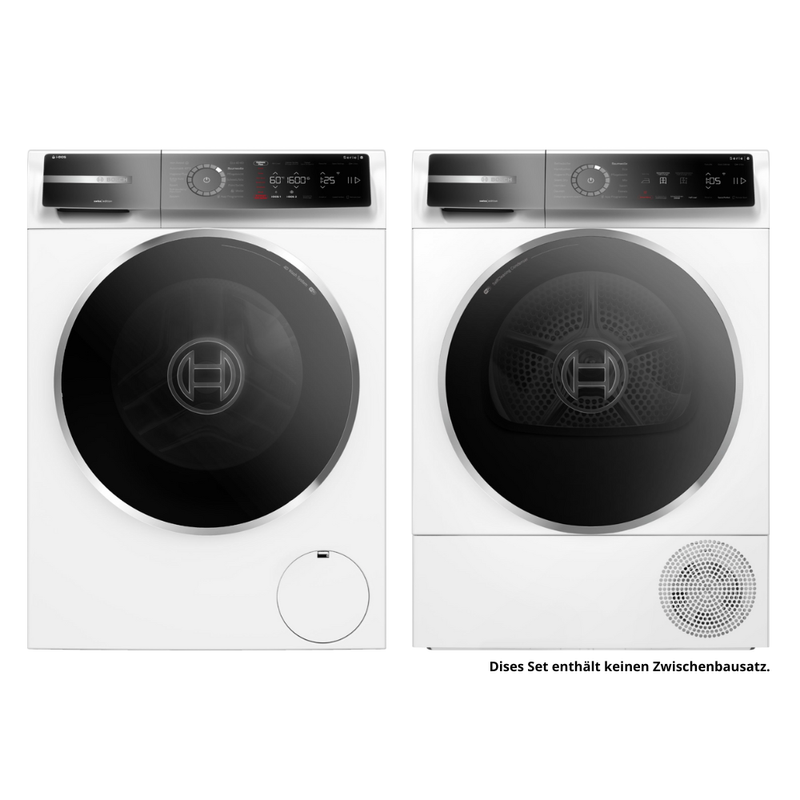 Optisch überzeugt das Wasch-Set durch ein klares, hochwertiges Design, das sich harmonisch in moderne Wohn- und Hauswirtschaftsräume einfügt. Die Serie 8 von Bosch steht für präzise Verarbeitung, langlebige Materialien und innovative Technik. Diese Kombination sorgt für ein ruhiges, zuverlässiges Arbeiten im Hintergrund, selbst bei häufigem Gebrauch.
