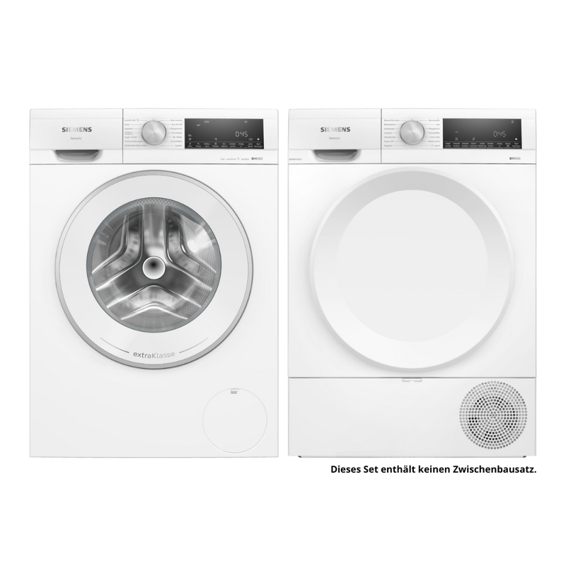 Ergänzt wird das Set durch den Siemens WQ33G2EEM iQ500 Wärmepumpentrockner mit einer Kapazität von ebenfalls 9 kg. Die Wärmepumpentechnologie ermöglicht ein besonders schonendes Trocknen bei niedrigeren Temperaturen. Dadurch werden die Fasern weniger belastet, was dazu beiträgt, dass Kleidung ihre Form und Qualität länger behält. Die Energieeffizienzklasse C bietet einen ausgewogenen und kalkulierbaren Betrieb, der sich gut für den regelmäßigen Einsatz eignet. Die Wäsche wird gleichmäßig getrocknet und fühlt sich angenehm an, ohne unnötige Hitzeeinwirkung.