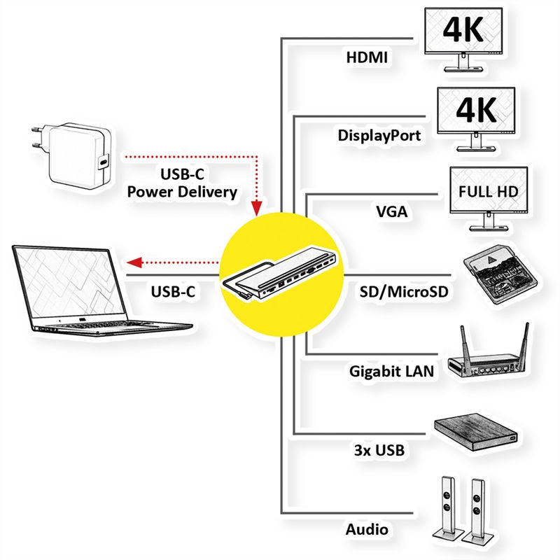 VALUE USB 3.2 Gen 2 Typ C Multiport Docking Station, 4K HDMI/DP, VGA, USB, Card