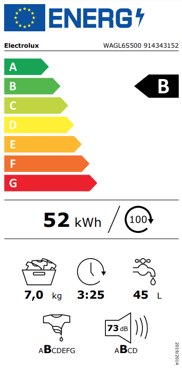 | Produktbeschreibung kurz | Freistehende Waschmaschine mit 7 kg Fassungsvermögen, 1200 U/min Schleuderleistung, Energieeffizienzklasse B und 45l/Zyklus Wasserverbrauch. |